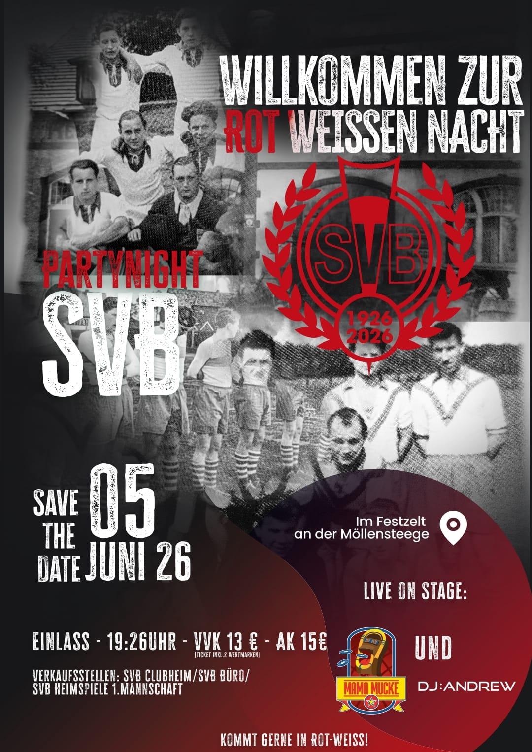 Am 05.06.2026 feiert der SVB sein 100-jähriges Bestehen im Festzelt an der Möllenstegge. Karten gibt es im Vorverkauf in unserem Clubheim/Büro und während der Heimspiele unserer Ersten.