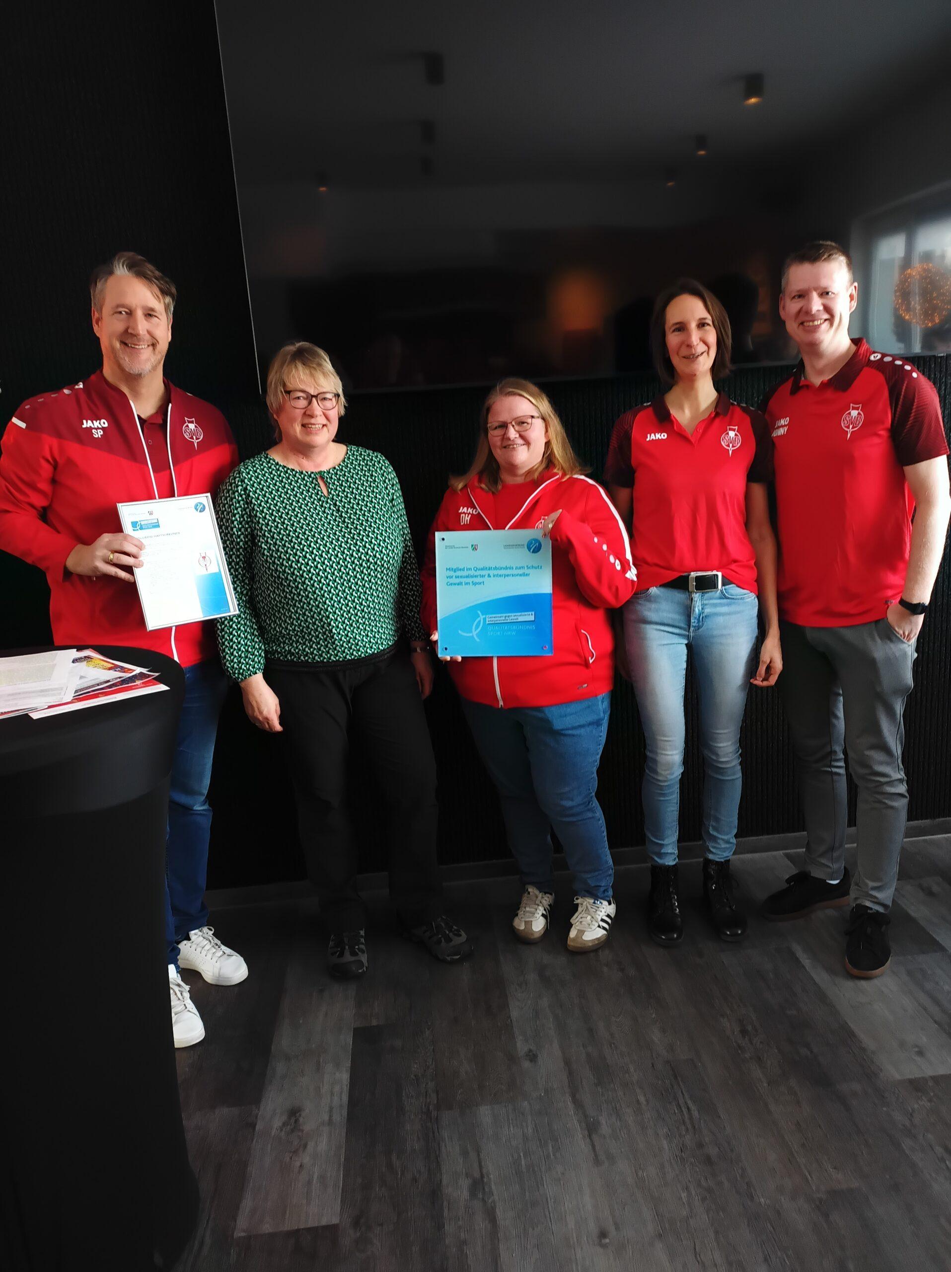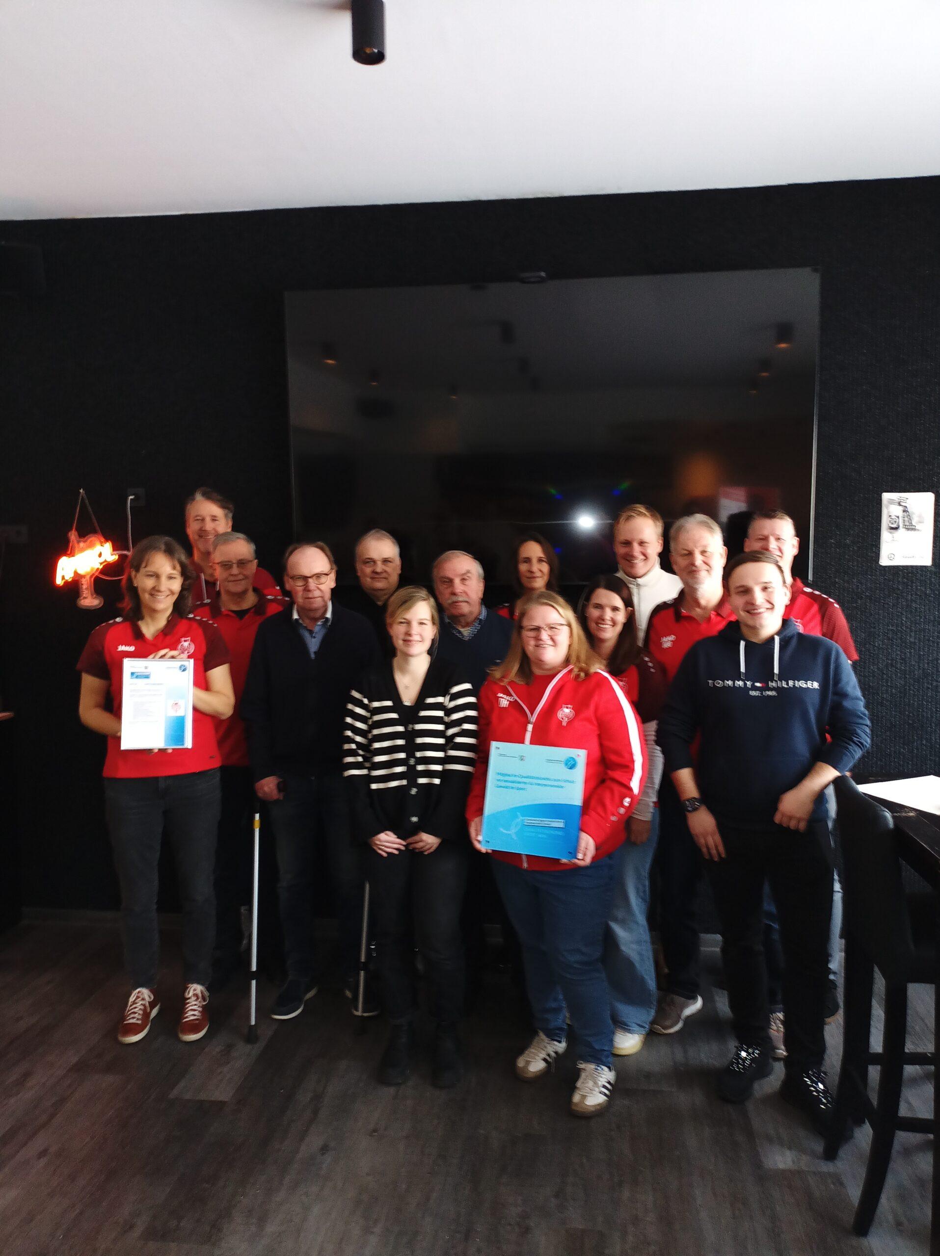 Hier übergibt Frau Hülemeyer vom Landessportbund unserem Präsidenten die Mitgliedschaftsurkunde fürs Qualitätsbündnis zum Schutz vor sexualisierter & interpersoneller Gewalt im Sport. Daniela Hauhoff hält als vereinsinterne Ansprechpartnerin das Qualitätszeugnis in der Hand. Abschließend gab’s noch ein Gemeinschaftsfoto mit den Geehrten und Verantwortlichen im Verein.