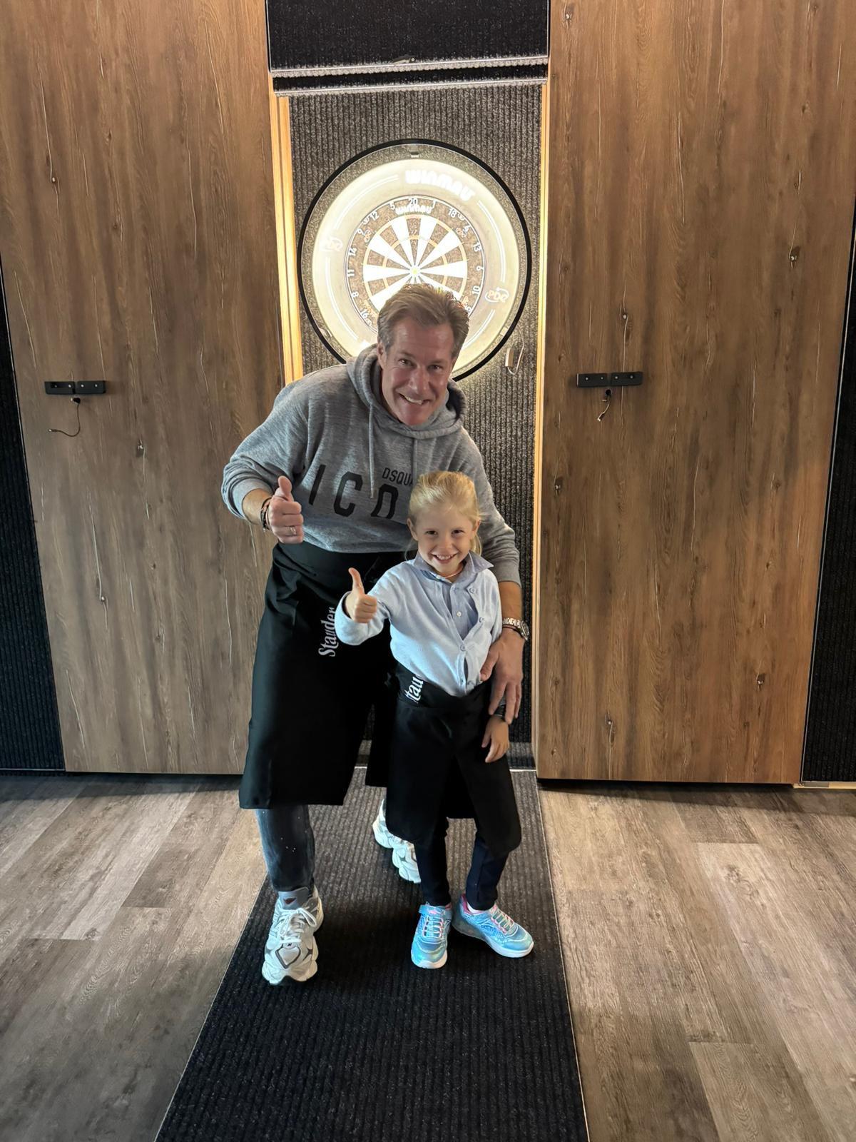 Ein zufriedener André mit seinem Patenkind vor den Dartsscheiben